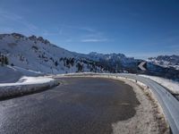 This is an image of a winding road in the German Alps, surrounded by snow-covered mountains and a clear sky. The asphalt road is wet from the melting snow, reflecting the sunshine. The landscape is a pristine wilderness, showcasing the beauty of nature. In the distance, the Armco barrier provides infrastructure and safety along the mountain pass. The view is breathtaking, with the sun visible and contrails streaking across the sky. This photo represents the winter scenery in Europe, specifically in Germany and Switzerland.