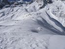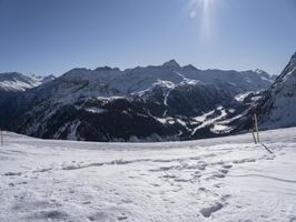 A breathtaking aerial view of a snow-covered slope in the French Alps. The clear sky contrasts with the white terrain and the majestic mountain range. Two airplanes leave contrails in the sky, adding to the picturesque scene.