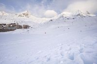 This photo captures a breathtaking winter landscape in the French Alps of Europe. The image showcases a skier making his way up to the ski lodge with majestic mountain peaks in the background. The open space and glacial snow create a picturesque view of the mountain range. The cloud-covered sky adds to the serene atmosphere of the scene. This popular tourist attraction offers a wide expanse of ski slopes and tracks for visitors to enjoy. It is the ideal destination for winter tourism, providing an overview of the stunning natural beauty of the alpine valley.