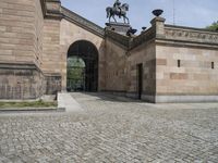 This stock photo captures the Alte Nationalgalerie in Berlin, Germany. The classic architecture of the building is beautifully showcased in the image. The outside entrance features a statue of a man on a horse, situated near a wall. The cobblestone road surface adds to the charm of the city. The facade of the building, adorned with arches and a grand entrance door, portrays the elegance of a palace or château. The photo was taken during the day, with a tree providing shade in the foreground. The urban design of Berlin is evident in this picture, reflecting the vibrant city life of Europe's capital. The Alte Nationalgalerie is a renowned museum, housing a remarkable collection of art. This image offers a glimpse of the rich cultural heritage and classic architecture that Berlin has to offer.