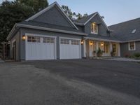 A suburban home in the USA, surrounded by a well-manicured lawn. Classic architecture with a garage door and siding. Clear dawn sky illuminates the entryway and driveway, creating a welcoming atmosphere.