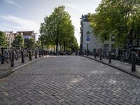A classic Amsterdam scene with bike racks and bicycles lined up on a brick road. The road stretches into the city, surrounded by beautiful architecture and vibrant city life. This is the epitome of urban design in Europe.