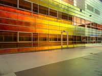 A modern office building in the business district of Amsterdam, Netherlands. The multicolored facade stands out against the orange road surface. European architecture at its finest.