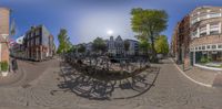 there are some bicycles parked in the center of this street area under the sun and clouds