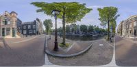 A classic Amsterdam street lined with historic buildings and cobblestone roads. The city's iconic canals are captured in panoramic images, showcasing the charming architecture and urban design. A perfect day to explore Holland's art district.