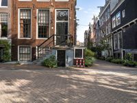 This image captures the essence of city life in Amsterdam, Netherlands. The classic architecture of the residential building with its distinct windows stands out against the clear sky. A brick-paved road leads to a staircase, surrounded by lush vegetation and bushes. The urban design of the neighborhood reflects the timeless charm of European cities. This photo represents a typical day in Amsterdam, where the paver road and classic architecture come together to create a picturesque scene.