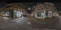 A three-lens fisheye photograph capturing the vibrant city life of Amsterdam, Netherlands. The bustling shopping area is illuminated by street lights, with storefronts lining the road. The urban design and dark night sky create a captivating atmosphere.