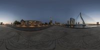 A circular photograph taken on the edge of a walkway, showcasing the stunning city skyline of Amsterdam, Netherlands. The modern architecture, cobblestone streets, and waterfront create a picturesque urban atmosphere.