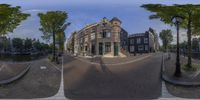 A vibrant street in Amsterdam, showcasing classic Dutch architecture. Cobblestone road, brick buildings, and tree-lined sidewalks create a charming urban atmosphere. The fisheye lens captures the essence of city life in Europe's art district.