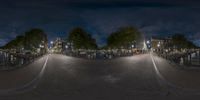 A night scene in Amsterdam, Netherlands. Classic architecture lines the streets with storefronts and residential buildings. The fish-eye lens captures the urban design and artificial lighting, creating a vibrant city life.