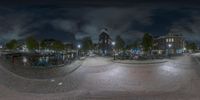 A panoramic view of Amsterdam at night, with people walking on the streets. Classic architecture and urban design create a charming atmosphere. Artificial lights illuminate the city, creating a stunning display of tints and shades.