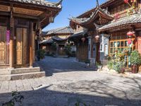 A charming side road in the ancient village of Lijiang, China. Cobblestone surface and historic architecture create a classic atmosphere. Clear skies highlight the beauty of this historic site and its traditional Chinese storefronts.