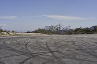 a view along a dirt road of an empty field and mountains in the distance of the scene
