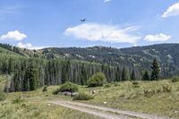 A picturesque view of the Colorado wilderness. The dirt road winds through the mountainous landscape, surrounded by dense forests. A small plane glides over the scene, adding a sense of adventure to the serene nature. Welcome to Antonito, Colorado.