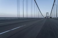 This stock photo features an approaching car on a bridge at dusk. In the background, there is blurry traffic with cars driving on the road. The image showcases the motion blur on the asphalt road surface. The bridge, a cable-stayed bridge, is a fixed link that connects two locations. The clear sky in the horizon adds a sense of tranquility to the scene. It captures the break of day, creating a surreal atmosphere. This photo is perfect for illustrating infrastructure, highways, transportation, and the concept of motion.