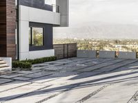 Modern architecture in Los Angeles, California. This residential area features open spaces and tree-lined streets. The facade of the homes displays clean lines and concrete surfaces. Clear sky and urban design make this villa stand out.