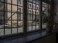 A view of a urban courtyard in Berlin, Germany. The architectural design features a mix of modern and industrial elements. The glass windows and metal surfaces reflect the city life. The courtyard is surrounded by buildings and trees, creating a vibrant and artistic atmosphere.
