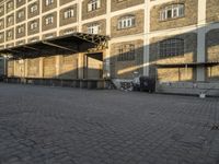 This is an image of a city street in Berlin, Germany. The photo captures the unique urban design and architecture of the city, with low-rise buildings made of concrete and metal. The cobblestone road surface and shadows cast by the dawn sunlight create a distinct atmosphere. The image also showcases the open spaces and courtyards that are characteristic of Berlin's neighborhoods. This photo represents the combination of history and modernity that defines city life in Berlin.