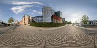 A snapshot of a modern architecture building in Berlin, Germany. The fish eye lens captures the unique arches on the sides, adding to the city's urban design. Clear sky and reflections on the building's facade create a stunning image.