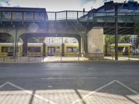 A classic example of Berlin architecture, showcasing the city's urban charm. The yellow and white train travels seamlessly on the road surface under the bridge. The sun visible adds a touch of warmth to the scene.
