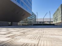 This stock photo showcases the modern architecture of Barcelona, Spain. The image features a futuristic business district with high-rise office buildings and a public plaza with a courtyard and water feature. The clear sky and natural lighting highlight the composite materials and wood flooring used in the structures. The elevated perspective captures the structure's unique facade, windows, and structural elements. The city life and urban design of Barcelona can be seen in the busy streets and street lights. This image is perfect for illustrating urban infrastructure, architecture, and city living in Barcelona and Europe.