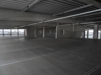 An urban scene in Berlin, Germany featuring a concrete street and modern architecture. The city is alive with activity during the day. The open space and parking garage add to the urban design of the city.
