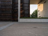 An urban scene in Berlin showcasing modern architecture. The parking lot sits empty with wooden buildings in the background. The structural elements of the buildings highlight the city's urban design. A snapshot of city life in Berlin.