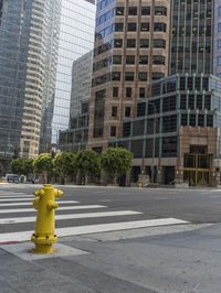 This is a vibrant city street in Los Angeles, California, USA. The image showcases modern architecture with high-rise buildings and office buildings. The asphalt road is lined with trees and vegetation, adding a touch of nature to the urban design. A yellow fire hydrant stands out in the foreground, symbolizing the city's infrastructure. The bright day illuminates the scene, highlighting the windows of the skyscrapers and towers. The image captures the bustling atmosphere of the business district in downtown Los Angeles.