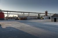 This is a photo taken in Toronto, Ontario, Canada during the dawn hours. The image captures the city's architecture and residential areas with clear skies above. The road surface is made of asphalt, leading to various buildings and houses. In the distance, there is an industrial area with factories. This photo represents the bustling cityscape and the mix of real estate and transportation infrastructure in Toronto.