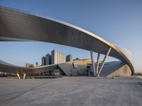 This stock photo features a large modern building in the city. The building has a curved structure over its roof area to the right. The architecture is futuristic and showcases a mix of composite materials. The building's facade is made of concrete, giving it an urban and contemporary look. The image captures the building in the daylight, highlighting the play of light and shade on its surface. The open space around the building adds to the overall appeal of the urban design. This building could serve as a headquarters or office building in a bustling business district. The architectural structure blends art and functionality, making it an ideal subject for architectural visualization (archviz) or showcasing modern urban landscapes. It could also be used in themes related to city life, museums, and urban art.