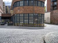 This stock photo showcases a classic brick and iron building in Germany. The building sits on the side of a road, next to a black and yellow bench. The architectural details, such as the brick wall, flooring, and curved facade, add charm to the urban design. The cloudy sky provides a dramatic backdrop to this European city scene. The cobblestone road and open space in the courtyard accentuate the timeless beauty of this Hinterhof. The image captures the essence of city life in Europe, where old warehouse buildings coexist with modern urban developments.