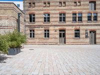 A beautiful building with a brick walkway next to green plants in planters on the ground. This photo captures the essence of Berlin, Germany with its classic architecture and urban design. The open space and courtyard provide a peaceful atmosphere in the midst of the bustling city life. The brick wall adds a touch of history to the scene. The clear sky enhances the beauty of the building, making it an ideal spot for photographing. This location is perfect for architecture enthusiasts and history lovers. It is also close to hotels, museums, and other attractions. Explore the charm of Berlin's urban landscape at this stunning warehouse turned hotel.