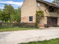 This image shows a typical rural landscape in Germany. In the foreground, there is a lush green field with grass and vegetation. A dirt road leads to a farmhouse with a red barn and a small shed. The house has a concrete street and a gravel land lot. The clear sky above contrasts with the clouds. This peaceful scene showcases the beautiful architecture and natural surroundings found in rural Germany.