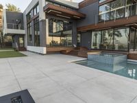 A stunning modern architecture building in Los Angeles, California, USA. The photo showcases the beautiful dawn light highlighting the impressive facade of this residential property. The sleek design, with its floor-to-ceiling windows and concrete surfaces, creates a perfect balance between indoor and outdoor living. The interior design is contemporary and stylish, featuring an open floor plan with spacious rooms and elegant tile floors. The property also includes a spacious courtyard, charming garden, and a refreshing swimming pool in the backyard. It is an ideal home for those seeking a luxurious and contemporary living experience in the heart of Los Angeles.