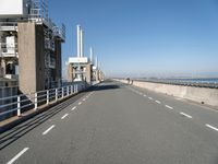 This photo showcases modern architecture in Holland with a highway running alongside the water. Two people can be seen walking along the road, surrounded by industrial buildings. The coastal landscape provides a beautiful backdrop, with a clear sky overhead. The straight road leads to a bridge spanning the water, while windmills and wind turbines dot the skyline. The image captures the essence of Holland's unique blend of city life and natural beauty, highlighting the country's renowned architectural style and its connection to the water.