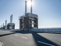 This stock photo showcases the modern architecture in Holland. The city landscape features high-rise buildings with contemporary designs and a mix of composite materials. The image captures a sunny day with clear skies, allowing the sunlight to cast hard shadows on the asphalt road and the roofs of the buildings. The coastal water and ocean can be seen in the background, adding to the picturesque nature of the scene. The presence of factories and chimneys indicates the urban and industrial nature of the location. This image perfectly represents the urban design and engineering of Holland, a country known for its innovative architectural designs.