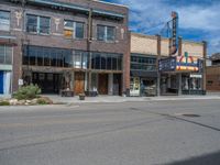 A classic architecture storefront in a rural town in Utah. The hard shadow of the building falls diagonally across the asphalt road. A cloudy day adds to the urban atmosphere.