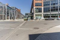 This stock photo showcases a modern architecture building in Toronto, Ontario, Canada. The city street is bustling with vehicles driving on the asphalt road surface. A clear sky highlights the sleek design of the building's windows. The urban design incorporates a curb and a driveway, providing an entry point to the property. A tunnel and crosswalk can be seen in the background, adding to the city life atmosphere. The hard shadows cast by the building create an intriguing profile on the road. This image captures the vibrancy and urban charm of Toronto, Ontario, Canada.