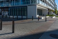 A view of a modern urban apartment building in Toronto, Canada. The clear sky and the absence of people on the sidewalk make the building, featuring large windows, stand out. The hard shadows create interesting patterns on the surface. This photo showcases the modern architecture and urban design in the city of Toronto, Ontario, Canada.
