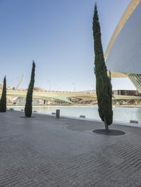 there are trees outside on the sidewalk in front of some buildings near water and a bridge