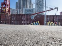 This stock photo showcases an urban architecture scene in Hong Kong. In the foreground, there is a crane near a long metal fence, while shipping boxes can be seen in the background. The image exhibits a bustling city with a clear sky and a busy road below. The vibrant metropolitan area of Hong Kong is captured, illustrating the high-rise buildings, condominiums, and infrastructure that characterize this bustling urban center in Asia. The photo also showcases the Happy Valley and Wan Chai neighborhoods, featuring the cityscape, downtown area, and a harbor pier. The image represents the industrial and tourist aspects of the city, along with the open space and art district. Overall, this photo captures the essence of Hong Kong's dynamic and vibrant human settlement.