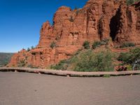 a person riding a bike in front of a mountain with cliffs and red rocks behind
