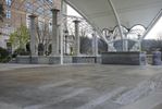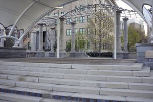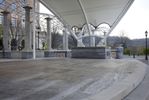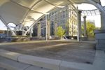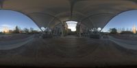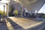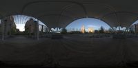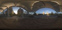 A panoramic view of Asheville, North Carolina. The walkway, lined with arches and columns, leads to a stunning dome-shaped structure. Sunlight casts shadows, creating a picturesque cityscape.