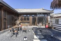 A classic villa courtyard in Lijiang, China. The open space captures the essence of Asian urban architecture. Clear skies create a serene backdrop for the elegant black and white furniture, complemented by a touch of orange.