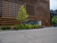 street corner with tree on the corner of the corner and a building behind it that is surrounded by multiple windows and a perforated brown lattice