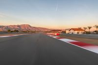 This is an image of a straight road on a race track in the USA at dawn. The asphalt road curves ahead, creating a thrilling racing experience. The break of day casts hard shadows on the road and surrounding landscape. The clouds in the sky add to the dynamic atmosphere of the image. This photo captures the excitement and intensity of race track racing at dawn.