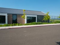 an asphalted parking lot in front of a building and several trees, bushes, and a fence
