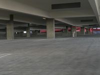 large empty parking garage with concrete pillars on either side and red light inside of it