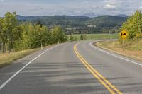 A scenic asphalt road cutting through the lush green landscape of Alberta, Canada. The road leads straight towards the majestic mountains, with dense forests and vegetation on both sides. A perfect day to embrace the beauty of nature.
