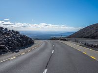 An asphalt road in Asia, straight down the landscape with clouds decorating the day sky. Overlook of a mountainous view in New Zealand's North Island. Nature's beauty captured in an overview of the road's path.